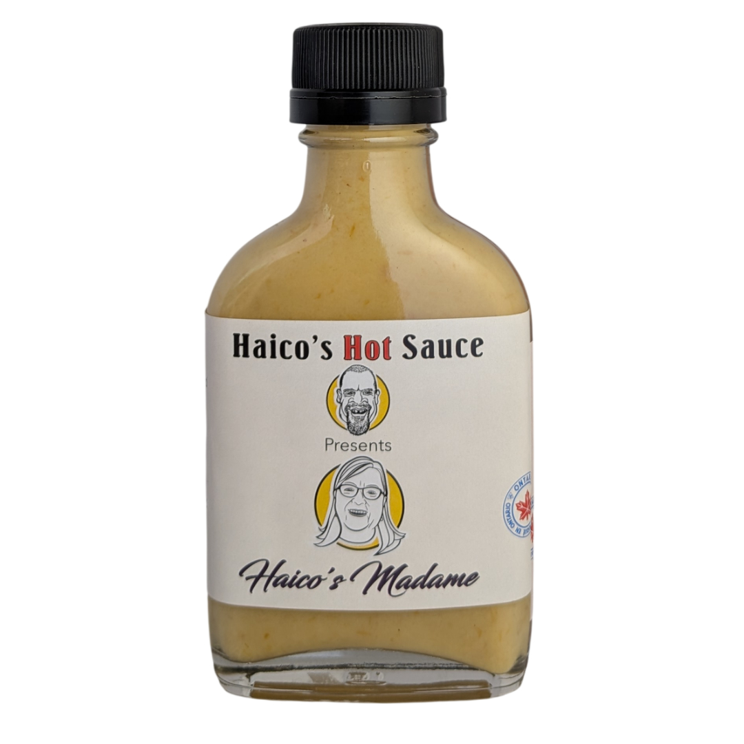 Developed by Haico to celebrate the 5th anniversary of Haico’s Hot Sauce in 2020. This sauce also is a tribute to his wife Angela who stands by him and assists him in any way she can to take over the world with hot sauce. The sauce is made with Haico’s favourite pepper, the Madame Jeanette that he ate while growing up in the Netherlands. It’s Haico’s favourite pepper and his favourite wife! – “Haico’s Madame” will transport you to the West-Indies and will give you a taste of the Caribbean. A great all round sauce that will go well on anything and highlights the distinct flavour of the Madame Jeanette pepper.